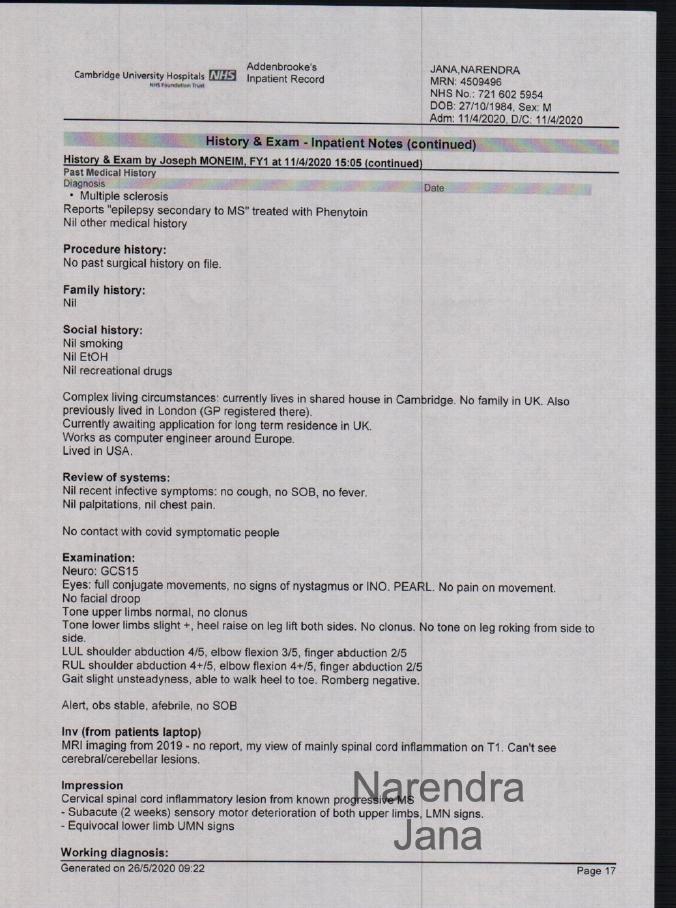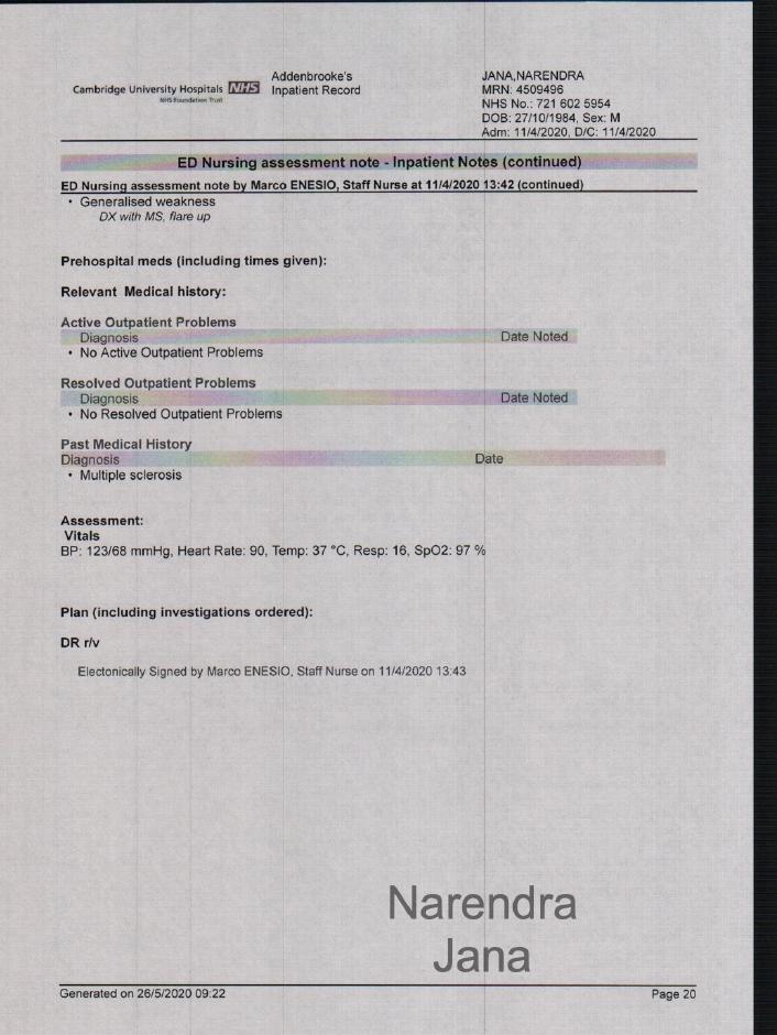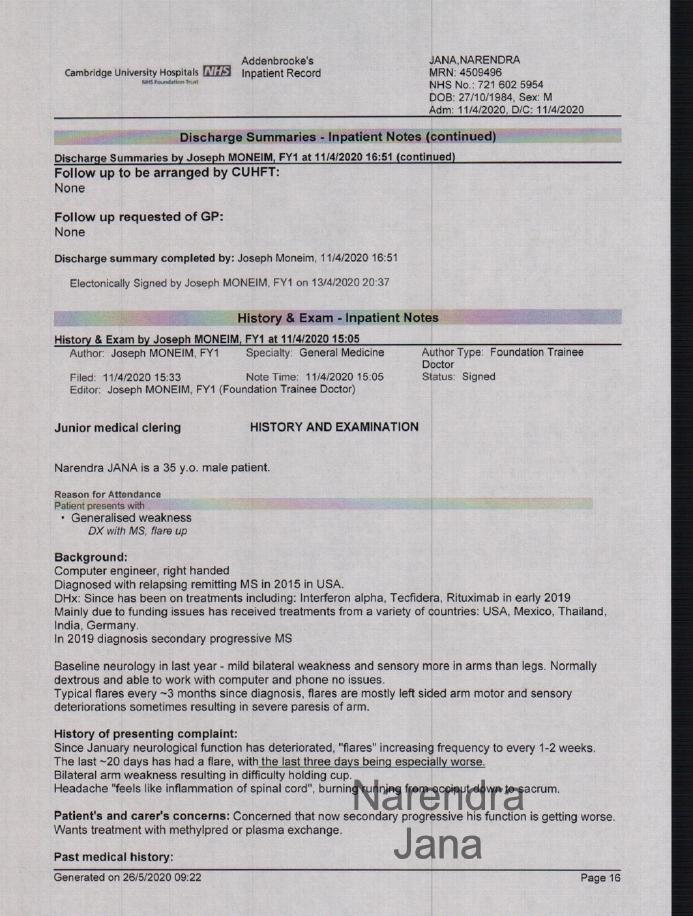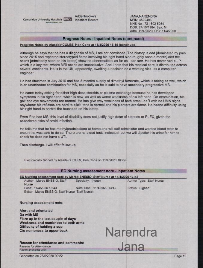 Reads Medical Note Due to Dr. Massey's refusal to read Medical data: Chat transcript Me (reading the medical note from the doctor): Ok so, is now developing into secondary progressive course as could be expected in a progressive neurological condition. Massey: Your being discharged, so im going to give you this letter Me: So there is an urgent need for medications for MS, Mr. Narendra Jana is currently taking medications for it. Massey: This is saying that [you are being discharged]..... I will let you read this over lunch. End Transcript