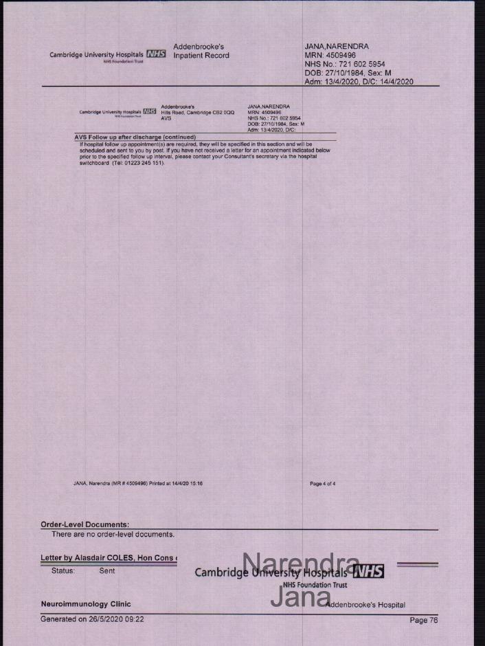 Discharge is directed through a clinician that isn’t in Addenbrookes Hospital. |